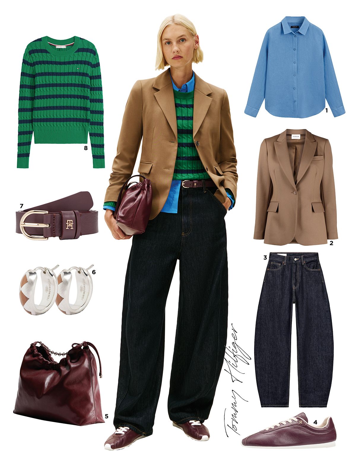 1 셔츠는 11만원대 Massimo Dutti. 2 테일러드 재킷은 90만원대 P.a.r.o.s.h.. 3 데님 팬츠는 7만원대 Zara. 4, 7, 8 스니커즈는 18만원대, 벨트는 9만원대, 스트라이프 톱은 48만원대 Tommy Hilfiger. 5 호보 백은 4만원대 H&M. 6 귀고리는 52만원 Jem&Pebbles.