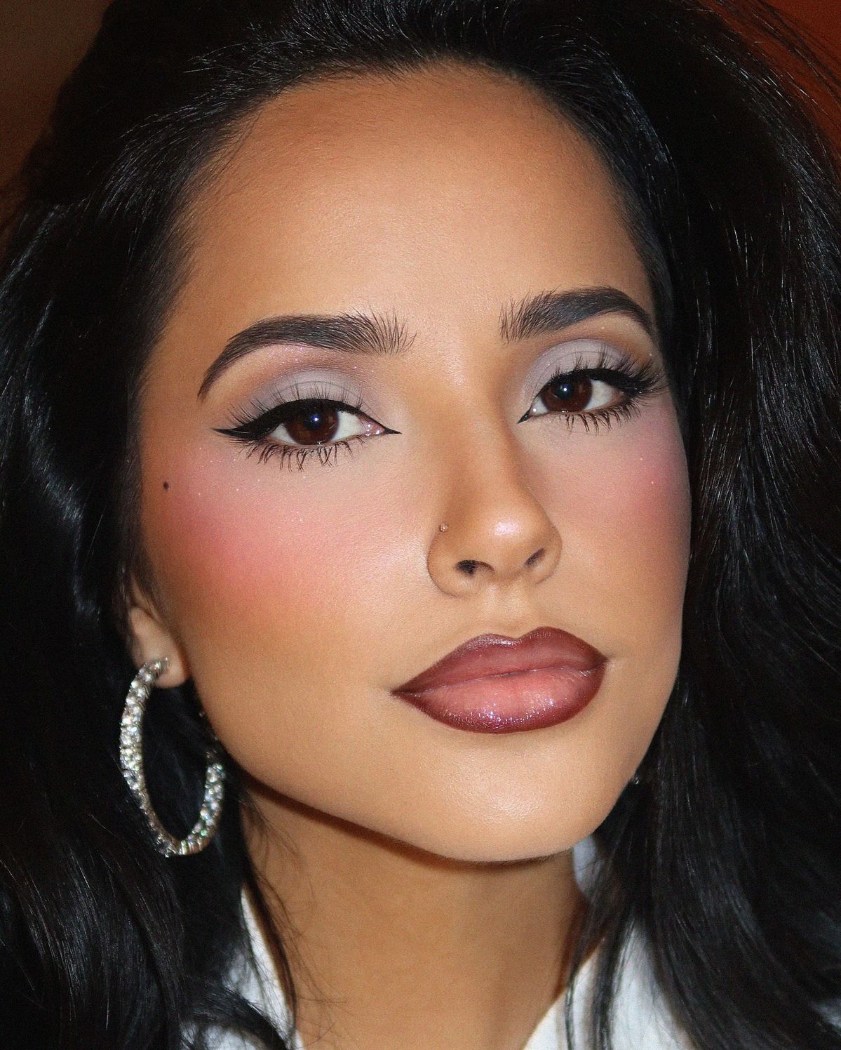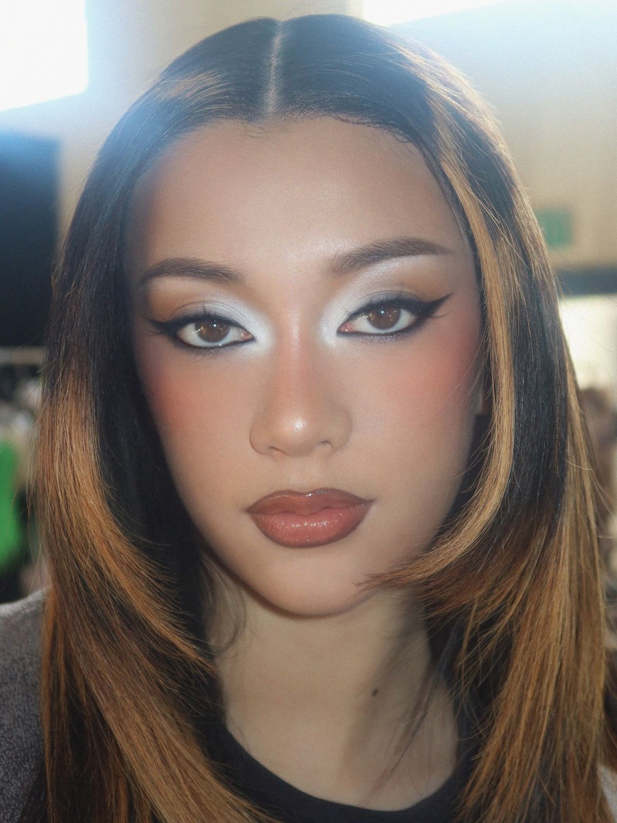 메간 룩의 포인트는 눈 앞머리를 밝히는 화이트 매트 하이라이트. 언더라인까지 이어지는 블랙 아이라인과 대비를 이뤄 눈매를 한층 또렷하게 강조한다.