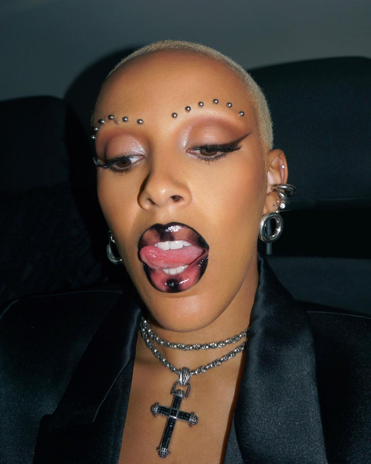 소피아 시노트도 도자 캣을 만나면 더욱 실험적인 메이크업에 도전한다. 브로우를 과감히 지우고 그 자리에 볼 스터드를 얹어 피어싱처럼 연출하고, 아이는 아이홀 음영만 남겨 미니멀하게 정리했다. 번진 듯한 블랙 스트라이프 립에 투명 글로스를 얹어 시선을 집중시켰다.