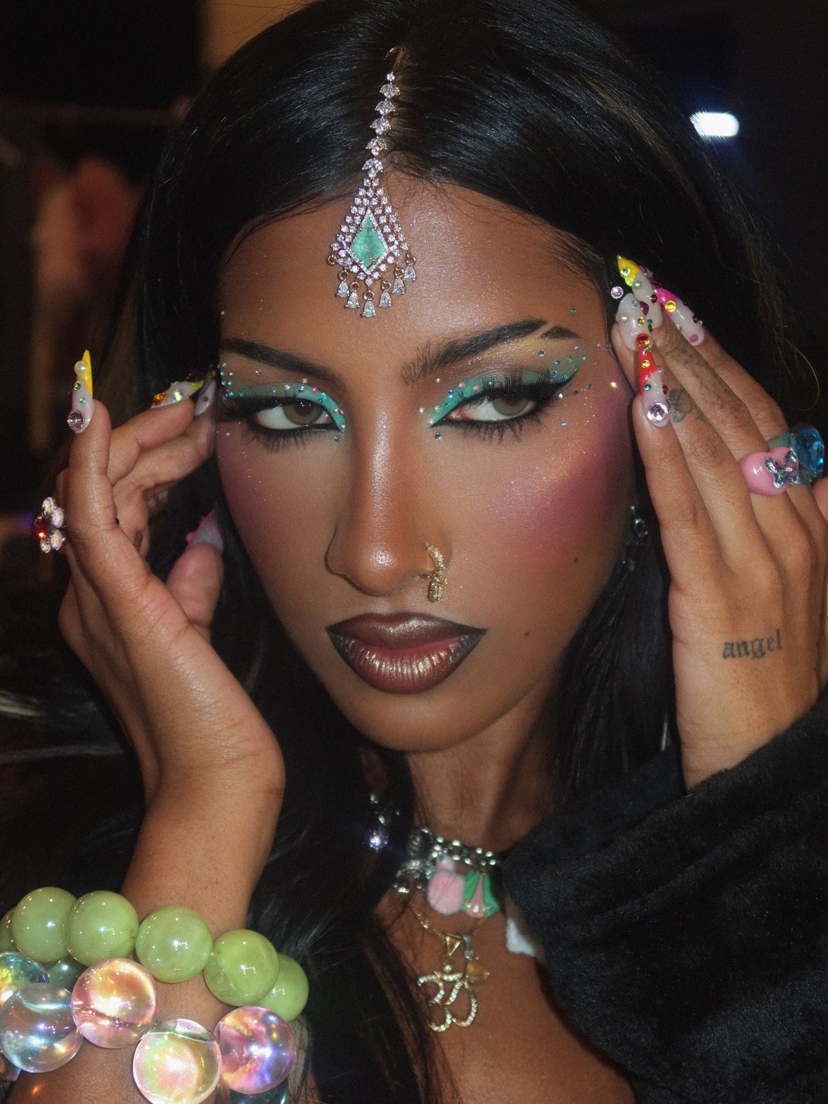 이마부터 정수리까지 이어진 큐빅 장식이 인도의 빈디(Bindi)를 떠올리게 한다. 인도계 배경을 지닌 멤버 라라의 정체성을 선명하게 드러낸다.