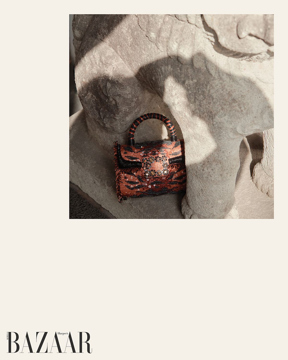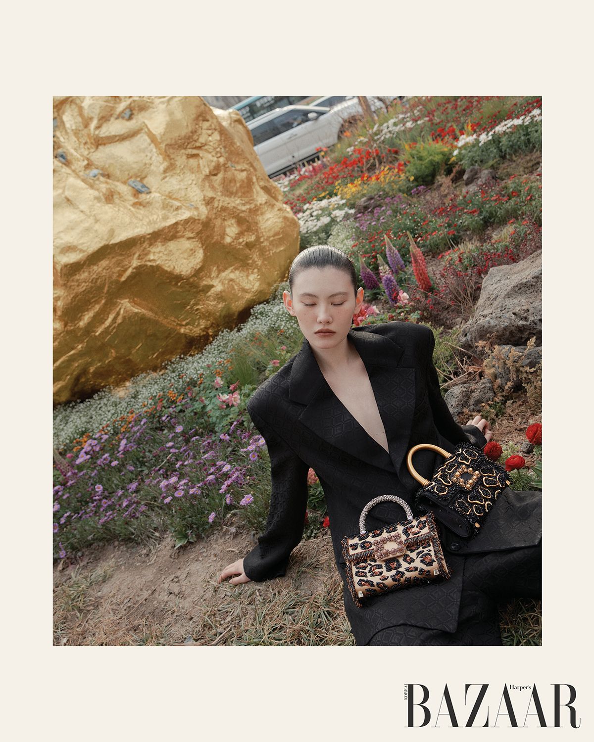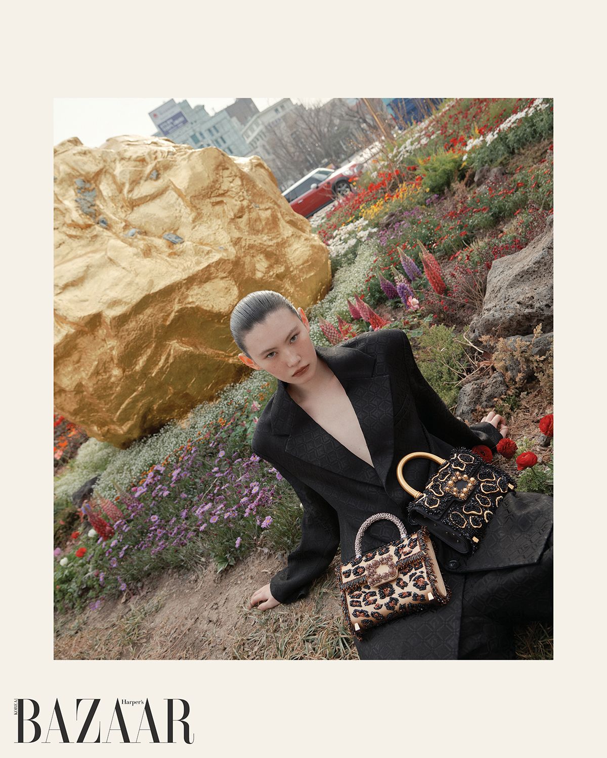 ‘포르트레 뒤 자구아르(Portrait du Jaguar)’ 백, ‘레오파르 드 뉘(Léopard de Nuit)’ 백은 Roger Vivier. 재킷·팬츠 세트업은 Marine Serre.