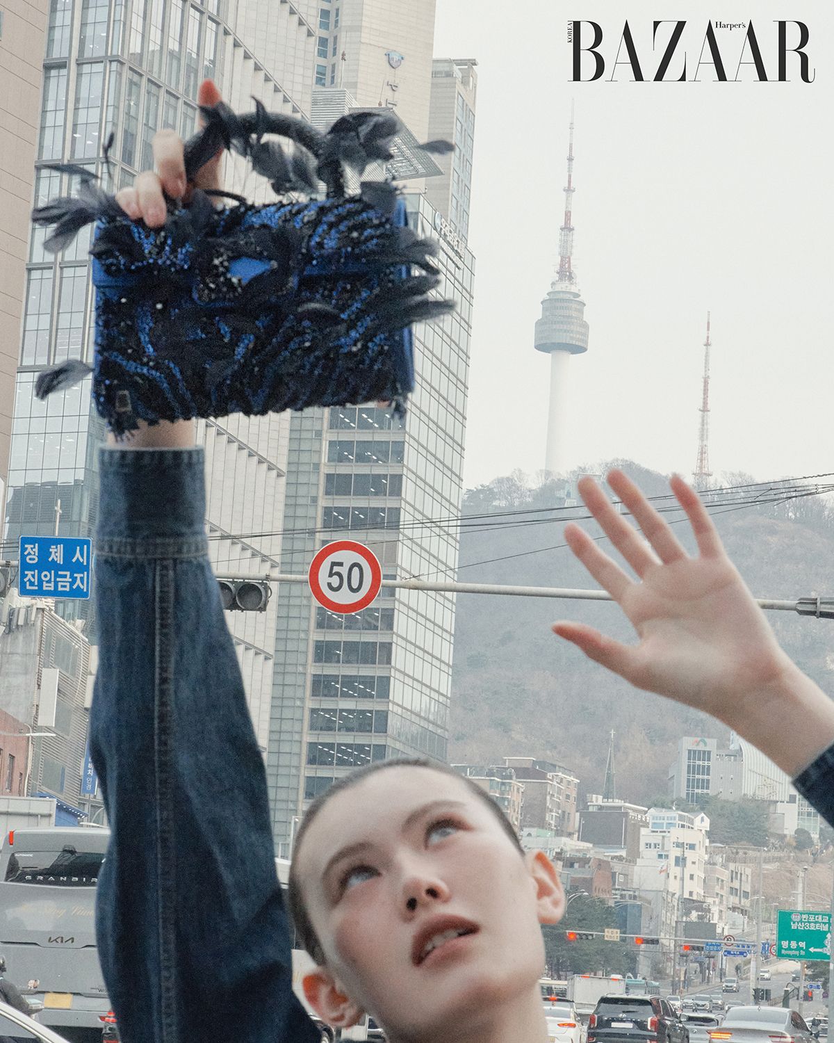 ‘제브르 녹튀른(Zèbre Nocturne)’ 백은 Roger Vivier. 데님 셔츠는 Sacai.