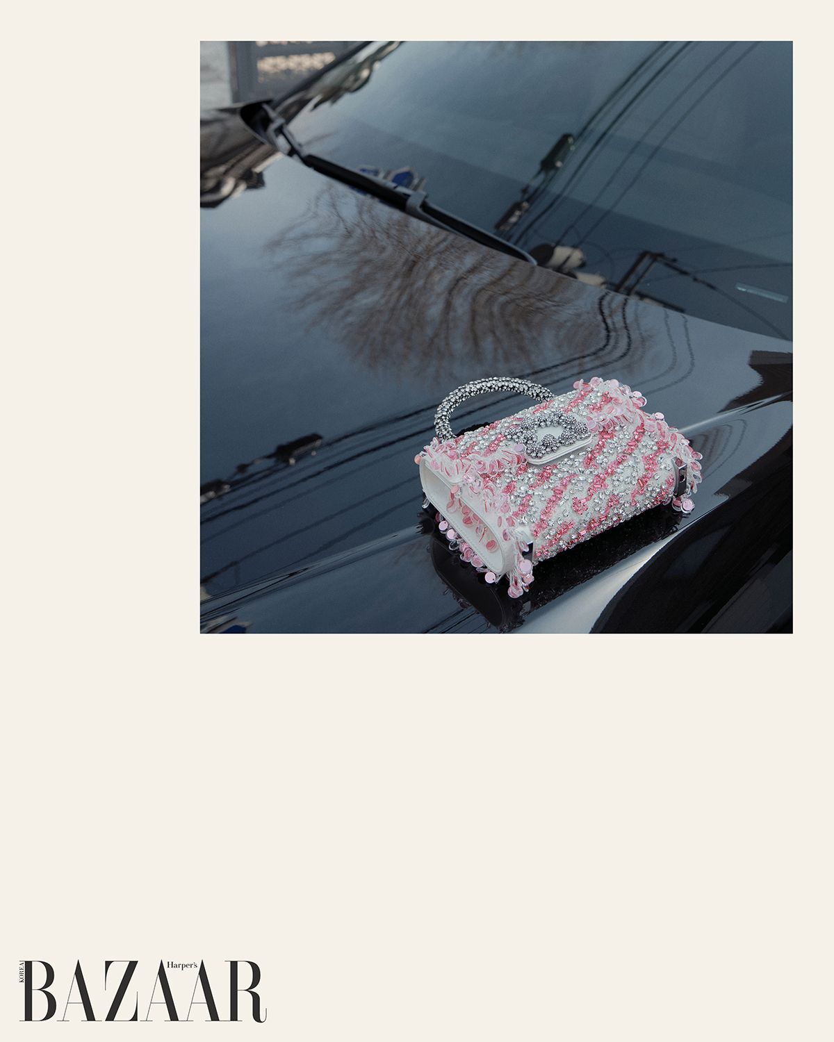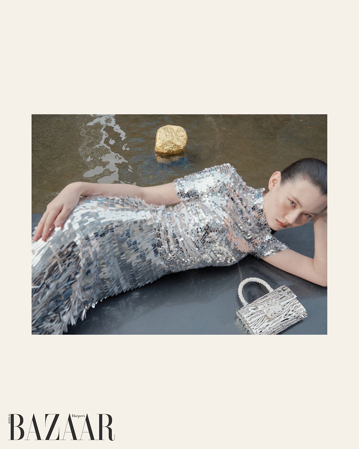 ‘에크랭 아르정테(Écrin Argenté)’ 백은 Roger Vivier. 시퀸 드레스는 Self-Portrait.
