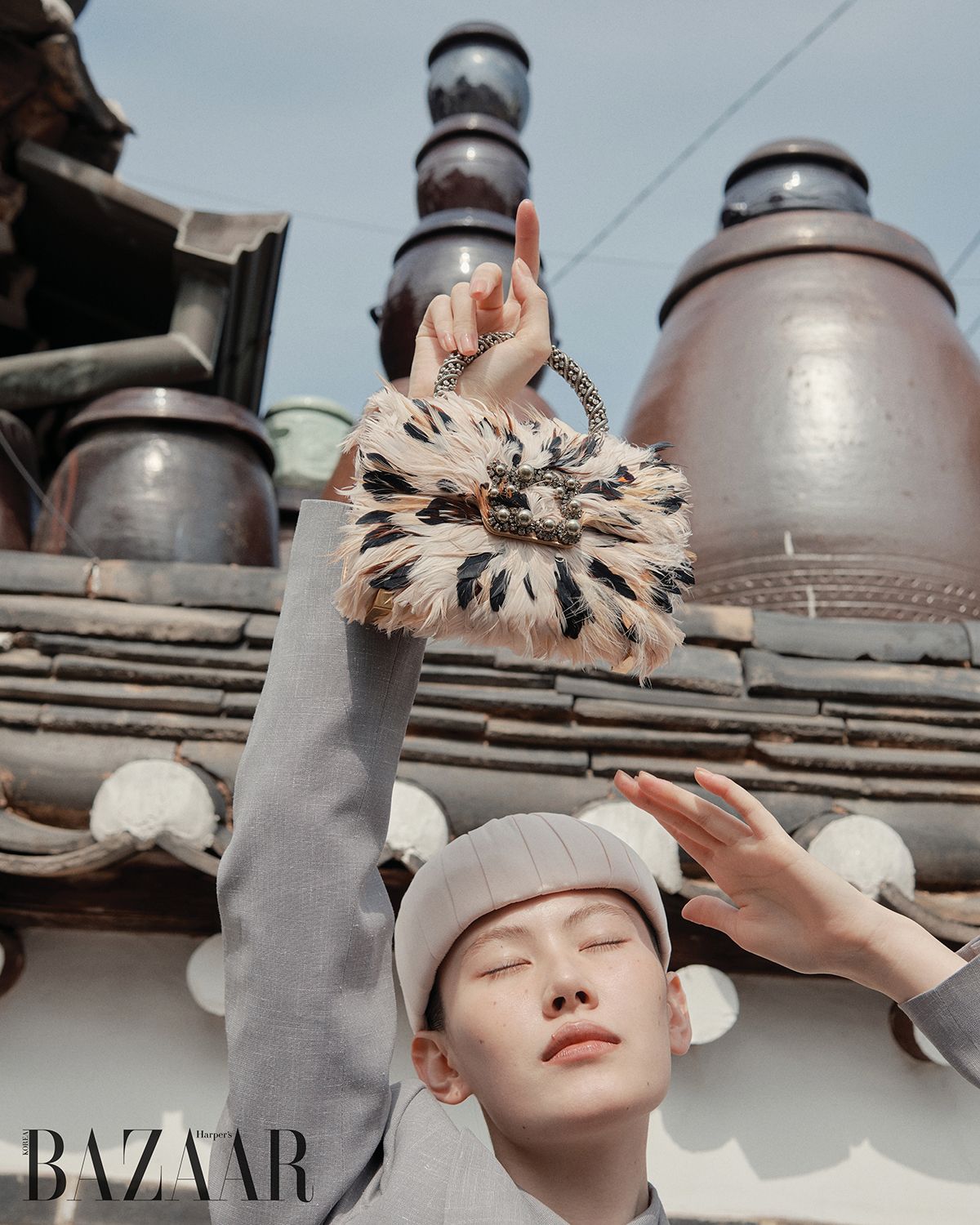 ‘게빠흐 엘레(Guépard Ailé)’ 백은 Roger Vivier. 재킷, 셔츠, 모자는 모두 Loro Piana.