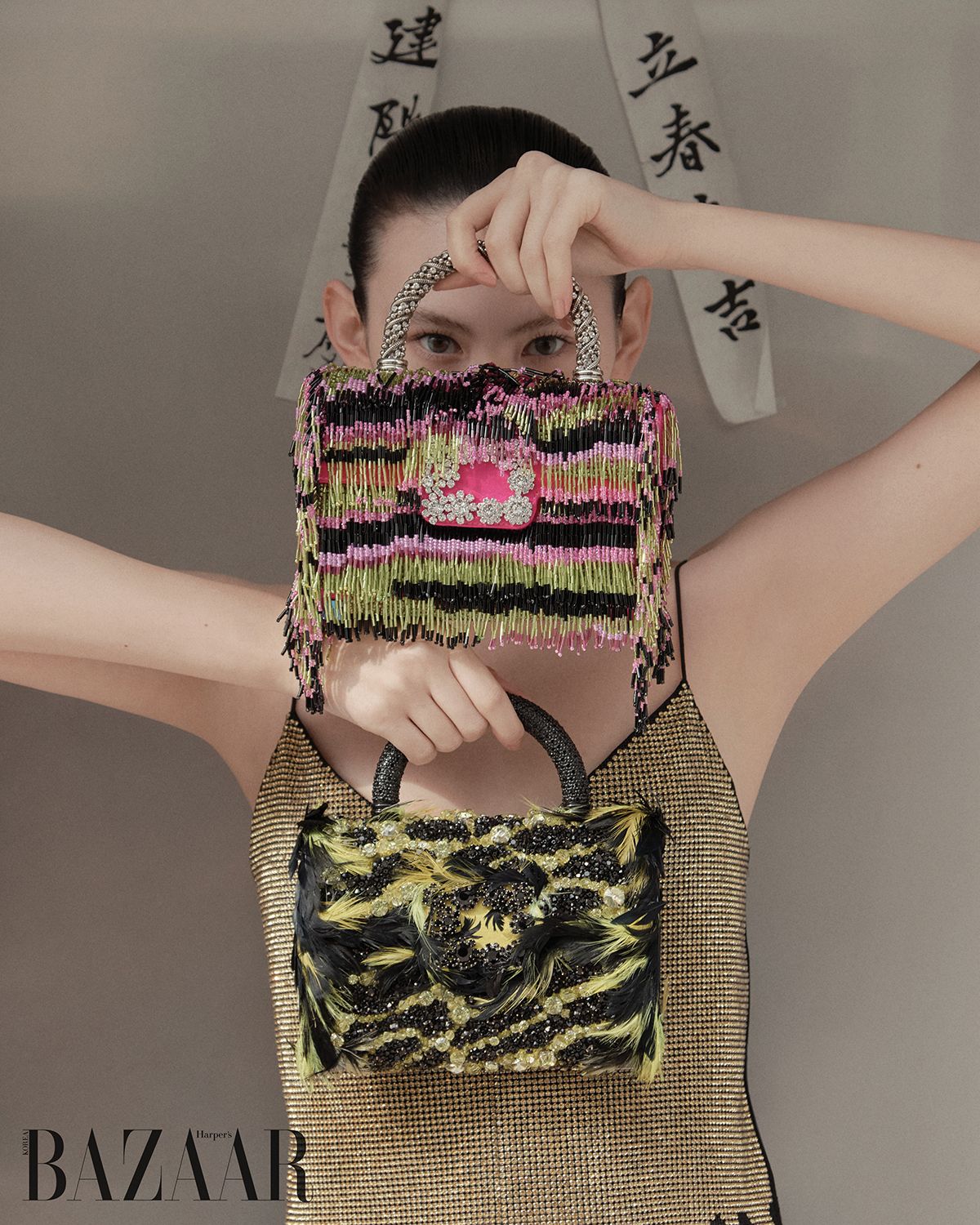 (위부터) ‘티그레스 폴(Tigresse Folle)’ 백, ‘파라다이스 느와르(Paradise Noir)’ 백은 Roger Vivier. 캐미솔은 Self-Portrait.