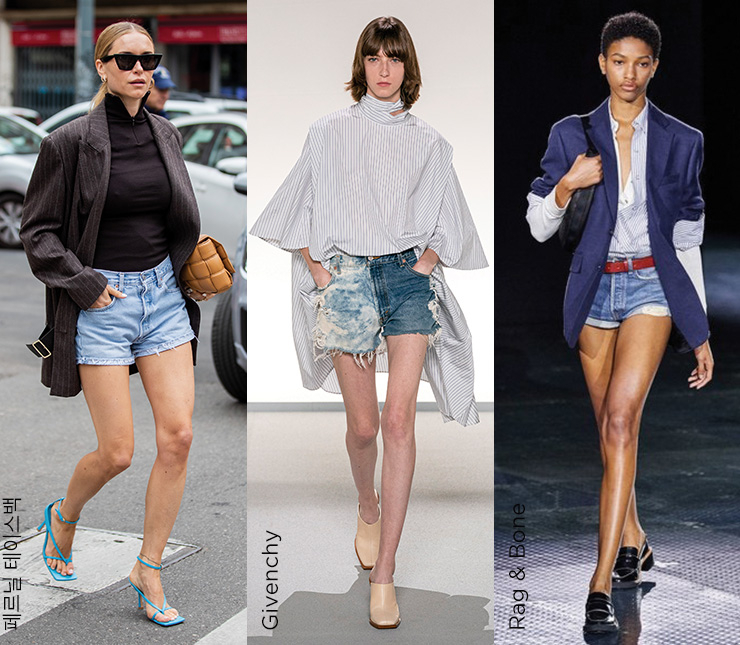 조츠(청바지와 쇼츠의 합성어, Jorts)의 젠틀한 변신! 이번 시즌 조츠는 캐주얼한 이미지에서 탈피해 반전의 매력을 꾀했다. 오피스 룩으로도 손색없을 정도. 물론 어떤 식으로 스타일링하냐에 따라 180도 달라지겠지만 무엇보다 노출을 최소화하는 것이 관건이다. 래그앤본처럼 바지를 덮는 길이의 재킷과 셔츠, 로퍼를 매치하면 포멀한 데님 룩으로 연출할 수 있다. 이때 여성스러움을 부각시키고 싶다면 페르닐 테이스백처럼 스트랩 샌들을 선택할 것. 오버사이즈 셔츠와 쇼츠를 조합해 실루엣 자체로 극적인 포인트를 만든 지방시도 멋스럽다.
