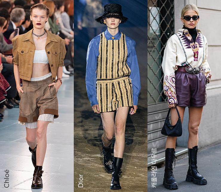 허벅지 중간 지점보다 살짝 아래로 내려오는 낙낙한 피트, 일명 미들 렝스 쇼츠는 톰 보이 룩부터 사파리, 유틸리티에 이르기까지 스타일링에 따라 다채로운 분위기로 변신 가능하다. 이번 시즌 특히 눈여겨볼 만한 예는 클로에의 위트 있는 스타일링. 크롭트 재킷, 브라 톱, 반바지 아래 입은 실크 스트라이프 복서 팬츠 등 상반된 분위기의 아이템을 한데 섞어 보이시한 보헤미안 걸을 완성했다. 마무리는 워크 부츠를 연상시키는 청키한 미들 부츠.