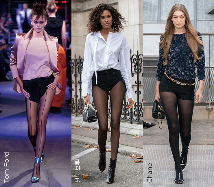 1961년 태생의 핫팬츠는 그 당시 한국 영화로 따지면 ‘천만 흥행’에 견줄 만큼 메가 히트를 쳤다. 이번 시즌 샤넬 쇼에 등장한 지지 하디드의 블랙 슬림 쇼츠는 1960년대 앤디 워홀의 뮤즈 이디 세즈윅부터 가깝게는 2007년 개봉한 <팩토리 걸> 속 시에나 밀러의 패션을 떠올리게 한다. 아찔한 길이에 저지 소재까지, 자칫 속바지처럼 보일 수 있으니 드레스업은 필수. 실키한 재킷(톰 포드)부터 화려한 액세서리(샤넬), 또 이디 세즈윅처럼 벌키한 니트도 금상첨화다. 이번 시즌 이토록 많은 디자이너들이 ‘더 짧게’를 외치고 있는 만큼 한껏 과감해져도 좋다. 벗은 듯한 하의가 허전하다면? 코코 샤넬의 조언을 놓치지 말도록. “스타킹 없이 밖을 나서지 말라.”