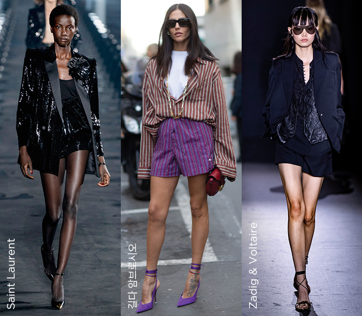 가장 글래머러스한 방식을 연출하고 싶다면? 쇼츠와 스틸레토 힐의 조합을 기억하라. 생 로랑 런웨이에 답이 있다. 안토니 바카렐로가 그동안 얼마나 많은 미니 쇼츠를 선보였는지, 그의 팬이라면 다들 고개를 끄덕일 터. 1960~70년대 록스타들의 스타일을 글래머러스하게 구현한 이번 시즌 역시 87개의 룩 가운데 무려 31개가 미니 쇼츠다. 특히 반짝이는 스팽글 소재의 턱시도 재킷과 쇼츠, 스틸레토 힐의 조합은 화려한 파티를 위한 가장 완벽한 스타일링이 되어줄 듯!