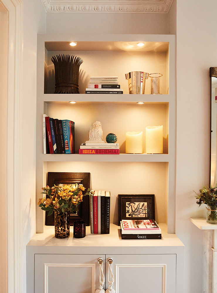 메인 베드룸에서. 카디건은 Simone Rocha. 스커트는 Victoria Beckham. 귀고리와 목걸이는 Annoushka. 반지는 Cartier. 힐은 개인 소장품으로 Rupert Sanderson.