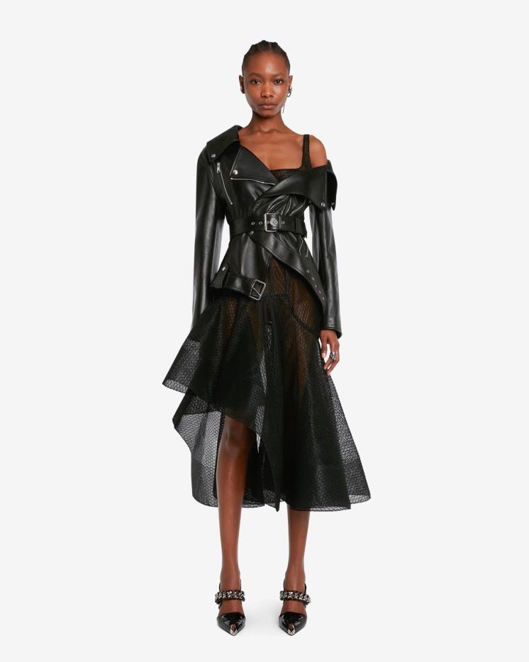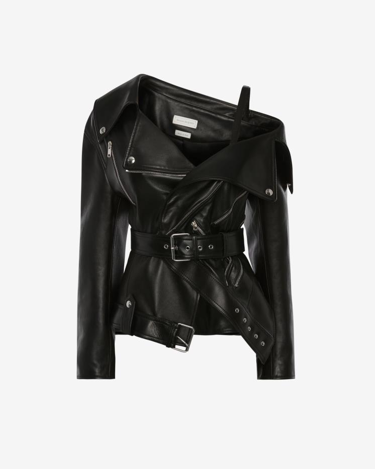 베이직한 디자인의 블랙 라이더 재킷을 이미 소장하고 있다면? 트위스티드 형태로 된 알렉산더 맥퀸의 바이커 재킷을 추천한다. 오픈된 네크라인과 버클 장식의 웨이스트 벨트가 우아하면서도 섹시한 무드를 선사하는 제품. 100% 양가죽 소재에 앞면과 소매 커프스 부분의 지퍼 디테일, 탈착 가능한 스트랩이 더해져 알렉산더 맥퀸만의 감각적인 디자인이 돋보이며, 고급스러운 룩을 연출해 준다. 페미닌한 드레스와 믹스 매치하기에 제격!