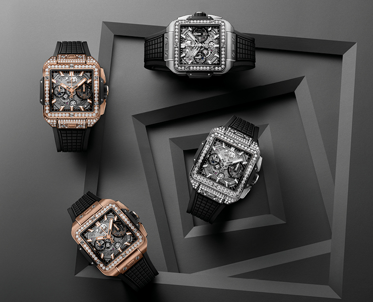 스위스 니옹의 워치메이커 위블로는 지난해 워치스앤원더스에서 새로운 케이스를 발표하며 빅뱅의 세계관을 확장했다. 바로 빅뱅을 베이스로 실루엣에 변화를 준 ‘스퀘어 뱅 유니코’. 이 화제의 작품은 올해 다이아몬드와 만나 새로운 이야기를 펼친다. 베젤에 총 1.9캐럿의 화이트 다이아몬드 44개가 세팅된 첫 번째 레벨을 필두로 점차 확장되는 4가지 세팅 레벨로 만날 수 있다. 극강의 화려함으로 주얼리 작품에 가까운 4번째 레벨의 시계에는 사각형 케이스 전체에 2백85개의 다이아몬드가 장식되었고 베젤 및 다이얼 전체까지 총 18캐럿의 다이아몬드가 세팅되었다. 화이트 골드나 킹 골드 소재로 제작되며 젬스톤을 고정하는 클로(claw)가 사라진 듯한 인비저블 세팅이 화려함을 더욱 극대화한다. 아워 마커, 케이스 플랜지, 타임 카운터에는 79개의 바게트 다이아몬드가, 러그와 브레이슬릿의 푸셔 그리고 폴딩 클래스프에는 30개의 바게트 다이아몬드가 정교하게 세팅되었다. 위블로의 빼놓을 수 없는 강점인 소재는 티타늄, 18K 골드에 구리와 플래티넘 합금으로 5N 골드에 비해 레드 컬러가 돋보이는 킹 골드 버전으로 선보일 예정.