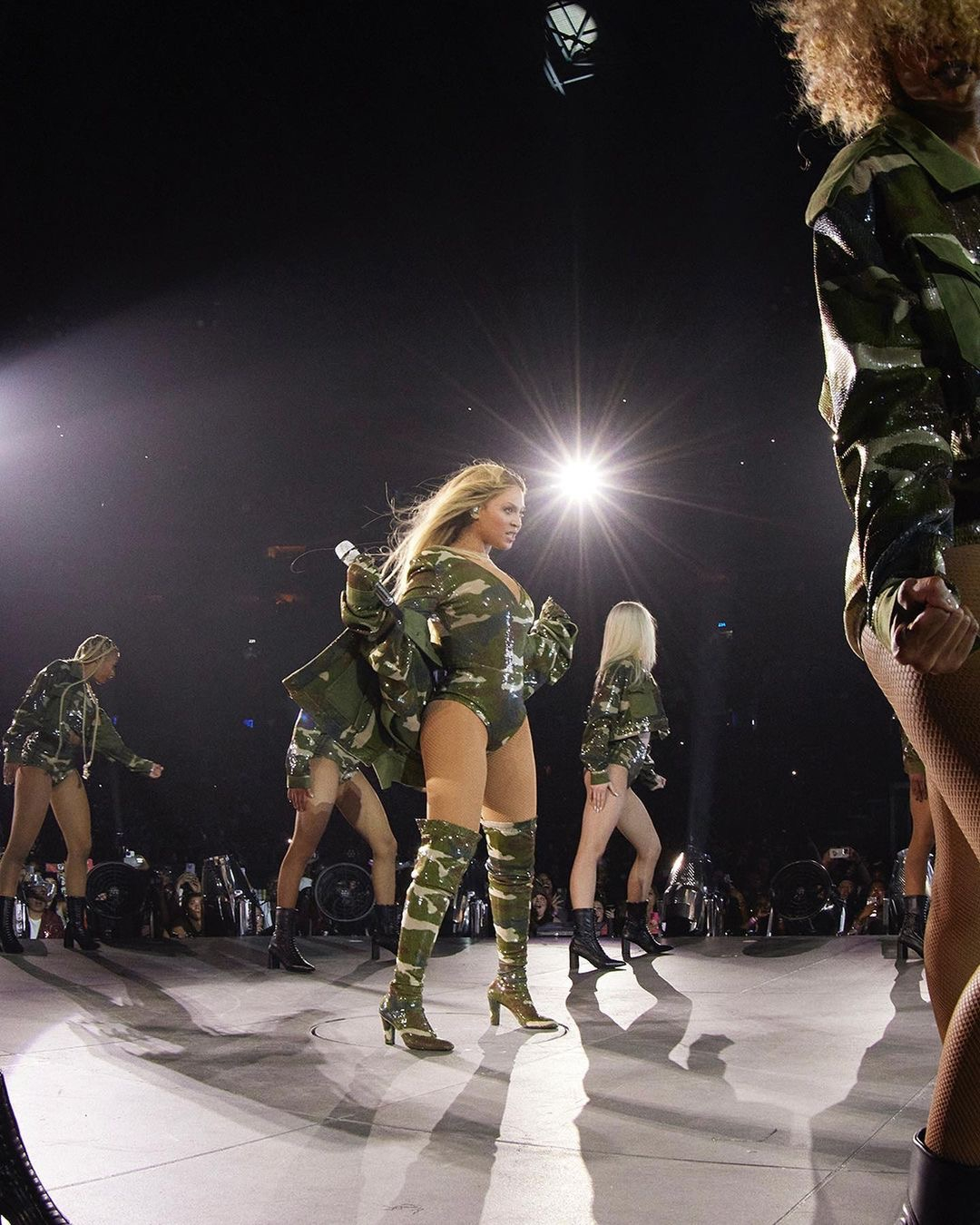 미국과 캐나다 투어의 오프닝을 위해 입은 이 룩의 정체는? 커스텀으로 만들어진 아이비파크(IVY PARK) 재킷과 맞춤 제작으로 만들어진 제데베(GEDEBE)의 사이하이 부츠, 카무플라주 패턴의 보디슈트, 피시 넷 스타킹으로 파워풀한 걸 크러시 면모를 뽐냈다. 여기에 로에베(LOEWE) 애너그램 마스크 선글라스와 넓은 챙이 돋보이는 루슬란 바진스키(RUSLAN BAGINSKIY)의 헷을 매치해 시크하기 그지없다.
