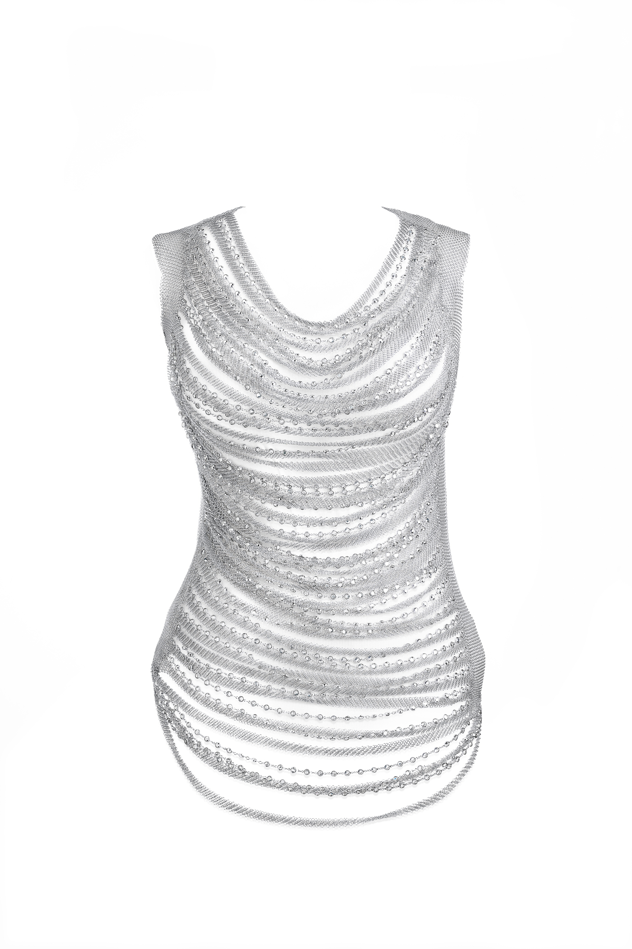 눈이 부실 정도로 화려한 이 드레스는 ‘르네상스 월드 투어'의 공식 협찬사인 티파니(Tiffany & Co.)가 제작했다. 티파니 디자이너 엘사 퍼레티의 상징적인 컬렉션 ‘다이아몬드 바이 더 야드(Diamonds by the Yard®)’와 메쉬(Mesh)에서 영감받아 커스텀 한 것. 메시 패턴과 베젤 세팅 스톤 체인으로 디자인된 드레스를 1970-80년도의 빈티지 티파니 이어링, 커스텀 티파니 빅토리아 다이아몬드 앵클릿과 함께 착용한 것. 약 150피트의 메시 리본과 30만 개의 링으로 짜여 패브릭처럼 흐르는 듯한 느낌을 연출한 게 특징. 장인의 수작업으로 200시간에 걸쳐 제작된 결과물로 더욱 화려하면서도 우아한 무대를 완성했다.