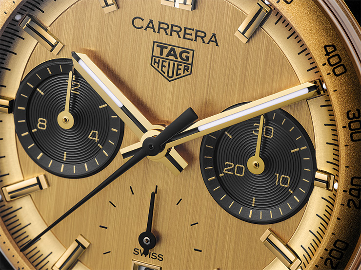 까레라 컬렉션 60주년 역사의 화려한 정점을 찍는 ‘태그호이어 까레라 크로노그래프 18K 3N 옐로 골드 케이스’. 이 타임피스는 클래식한 라운드 케이스, 완벽하게 통합된 러그, 2시 및 4시 위치에 배치된 사용자 친화적인 크로노그래프 푸셔를 장착했다. 이는 태그호이어 까레라의 변하지 않는 본질이라 할 수 있다. 각 푸셔는 시계의 빈티지한 매력과 모던한 감각을 우아하게 연결시키며, 고급스럽게 균형을 이루는 18K 3N 옐로 골드 도금 다이얼에서는 1960년대 오리지널 디자인에 담긴 정신을 엿볼 수 있다.