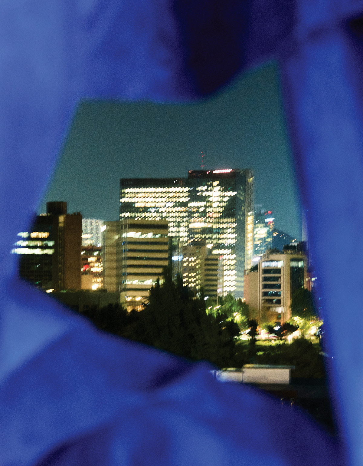 아드리안 비야르 로하스 개인전 «적군의 언어» 전시장 사이로 보이는 야경.