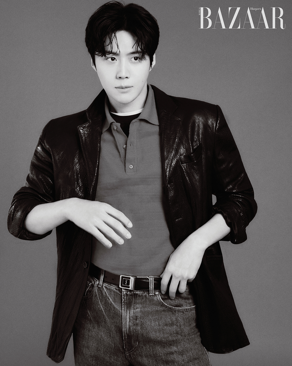 김선호가 입은 재킷, 이너 톱, 팬츠는 모두 Recto. 피케셔츠는 Golden Goose. 벨트는 Sain Laurent. 슈즈는 Amiri. 양말은 스타일리스트 소장품.